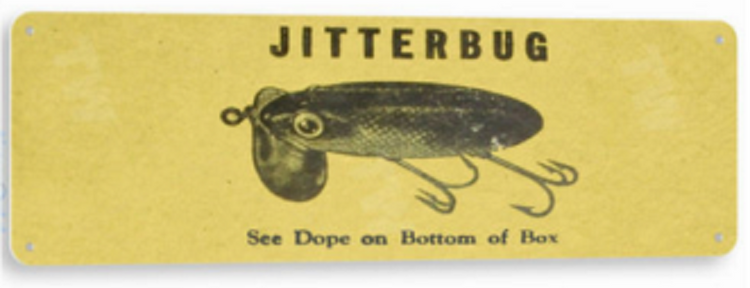 JITTERBUG FISHING LURE TIN SIGN 11 x 4 inch ARBOGAST JOINTED HULA POPPER 1.00